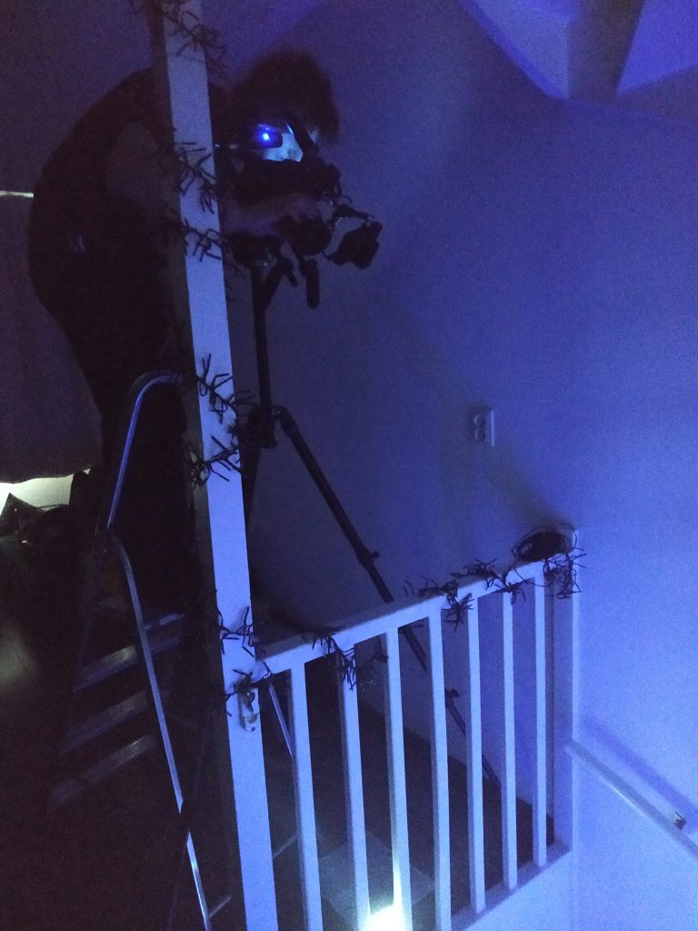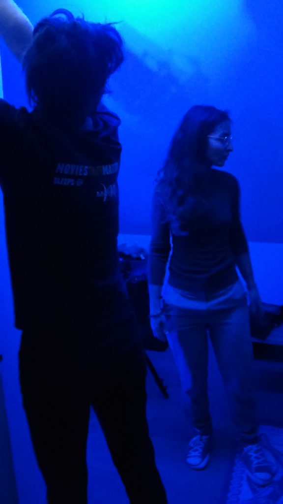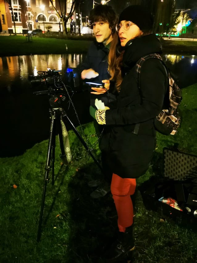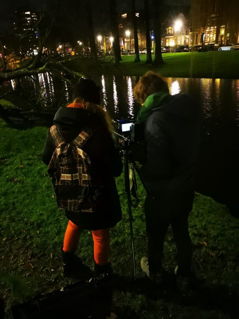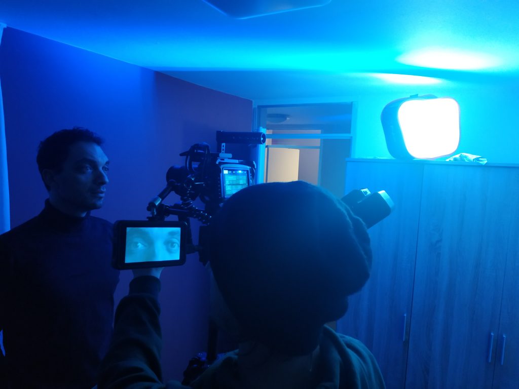 Along the way was the scheduling of the shooting. Three days were needed, two for external day and night shots and one whole day the internal main shot. With the on going changing restrictions however, that changed when overnight a lockdown after 22:00 was announced. Although this interfered with the planning, we reacted fast and with the help in the logistics of another friend we brought all the equipment with a car at the desired location. Even if it was January and super cold, I was very delighted to find ourselves in flow and really immersed into the experience of shooting the best frame. Similarly but with a much longer duration we gathered the three of us together early on a Saturday morning. Guiding the protagonist to be as closest as possible to the vision of the film was challenging for me. Finding the right vocabulary and transmitting it is an essential feature of a director and being called to put it together was a very interesting route for me. During the whole process I was very intrigued by the technical knowledge the DP had and felt very lucky being able to learn in his side. Being responsible both for the lighting and for the video (and the post production later on) he was definitely a multitool. Then, when all was shot and all wrapped up, the nice work together appear in each ones faces. Yes we were tired, but with a shared smile on our faces. Summing up the day, the experience was intense required non stop focus and energy and definitely a good team spirit. And the moving was already a big step ahead.